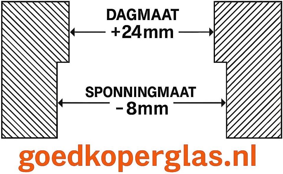 - Meet het glas van links naar rechts van glaslat naar glaslat, dit wordt ook wel de ‘dagmaat’ genoemd. Als u de dagmaat heeft gemeten, dan telt u 24 millimeter bij het dubbelglas op.